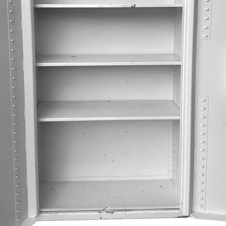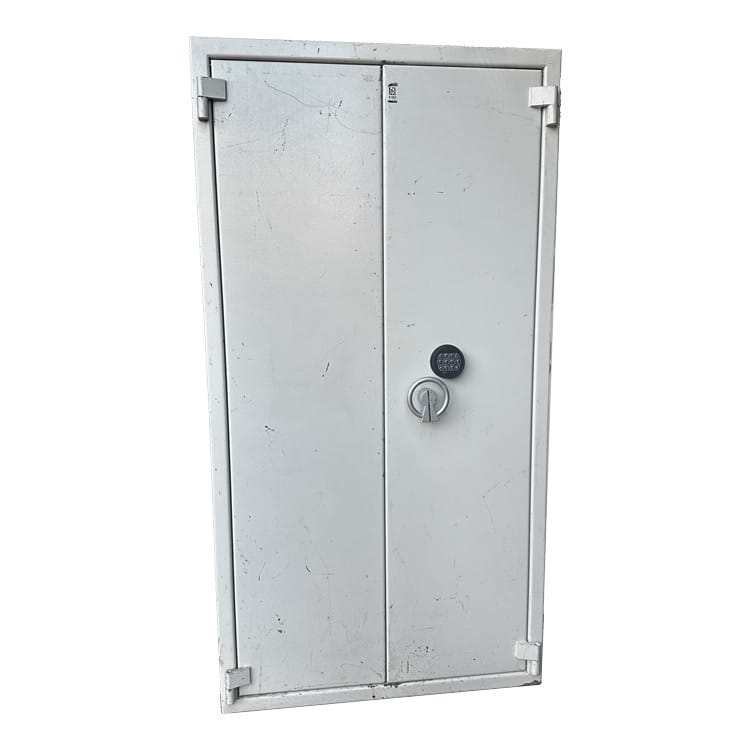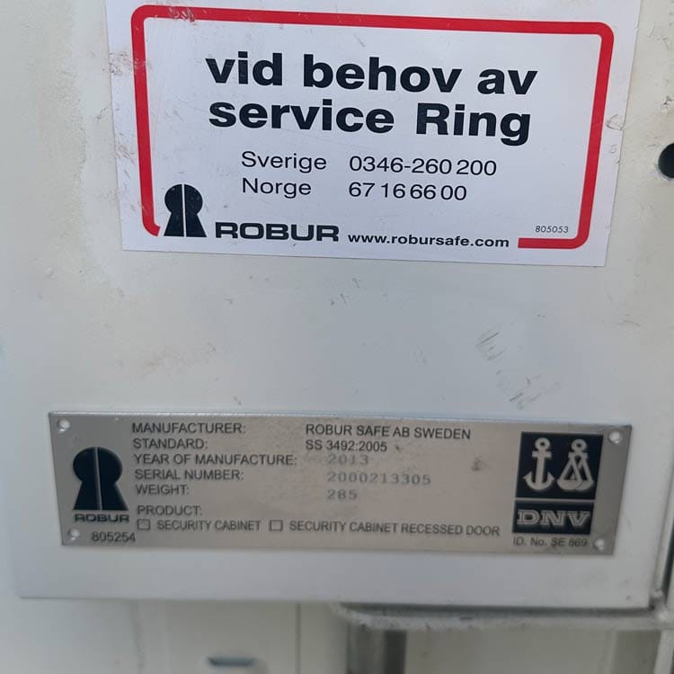 Stort begagnat dubbeldörrat säkerhetsskåp från Robur Safe. Skåpet är certifierat enligt SS3492 och är tillverkat 2013. Skåpet är utrustat med fyra justerbara helhyllor.
