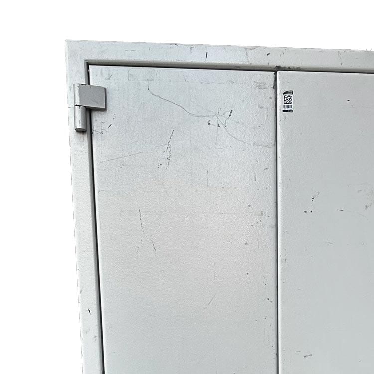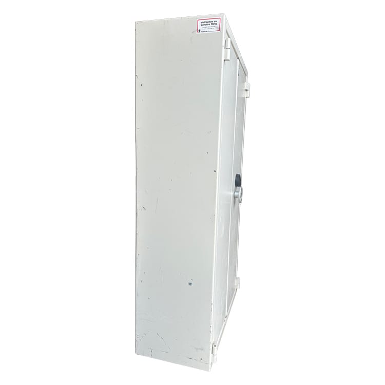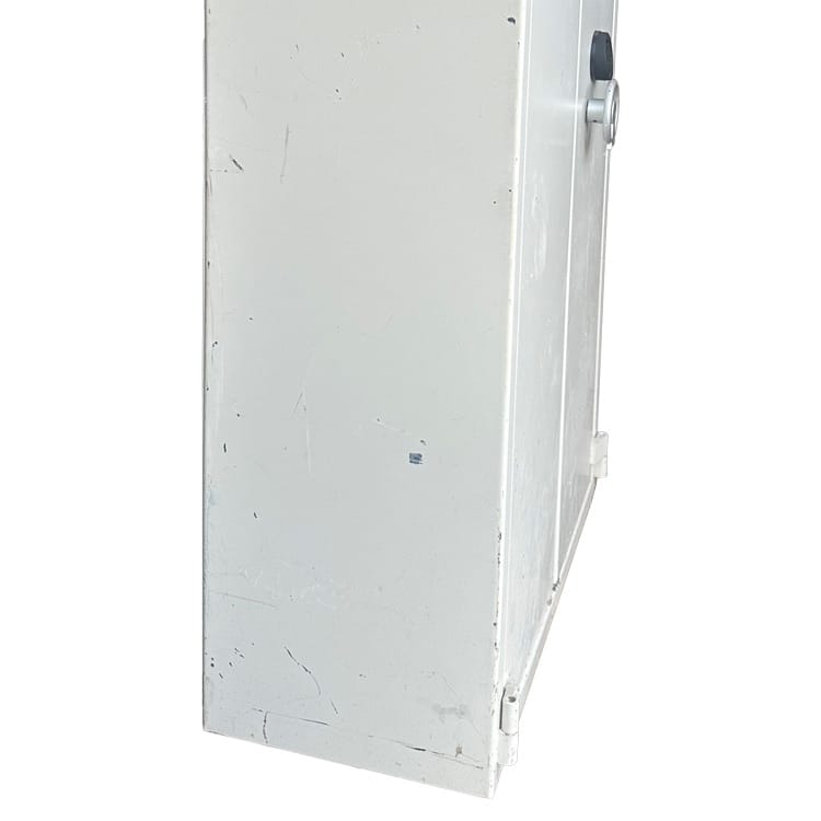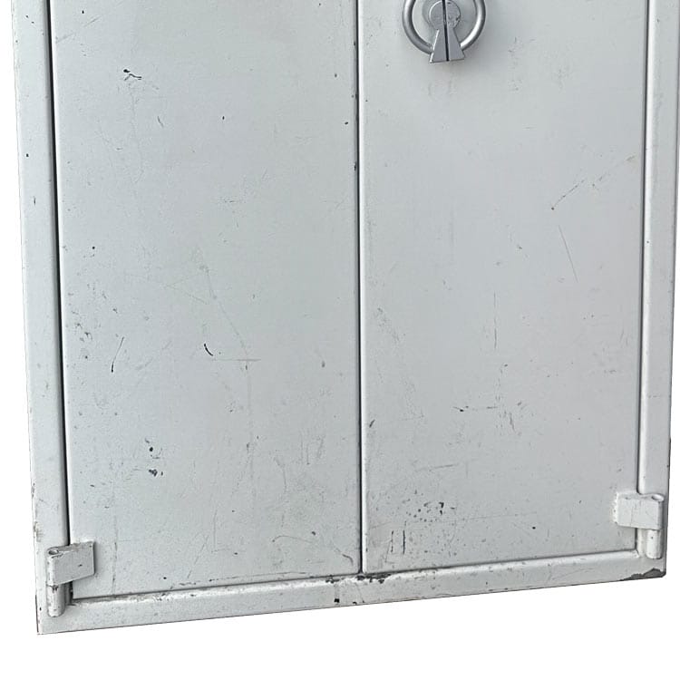 Skador i lacken från tidigare användning och har en lagning i ryggen (se bilder). Skåpet är nyservat, har ett nytt elektroniskt kodlås och regelverket fungerar bra.