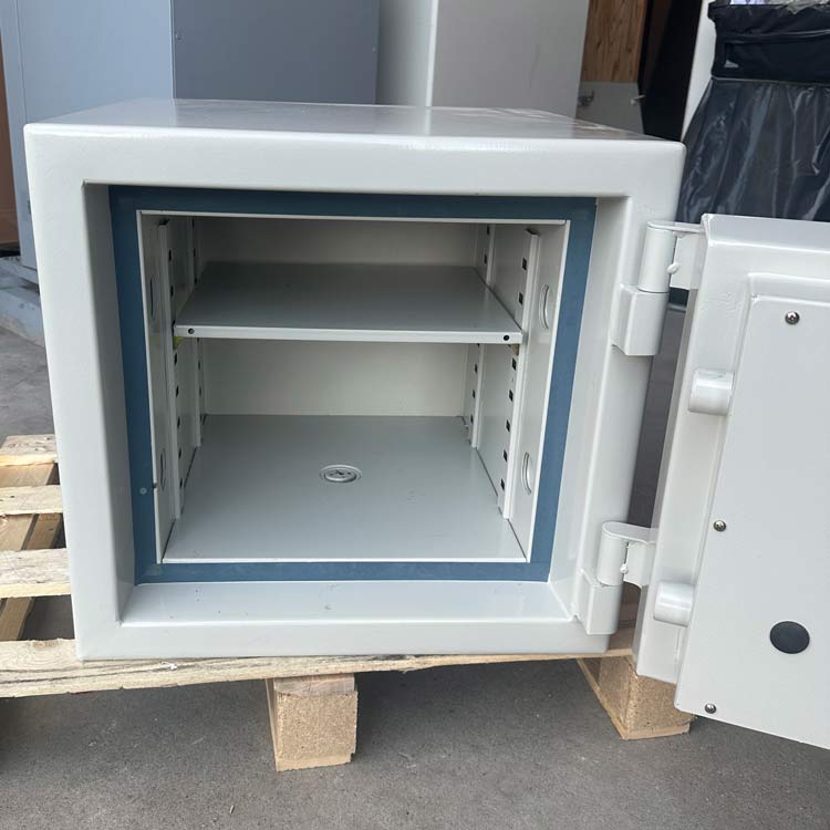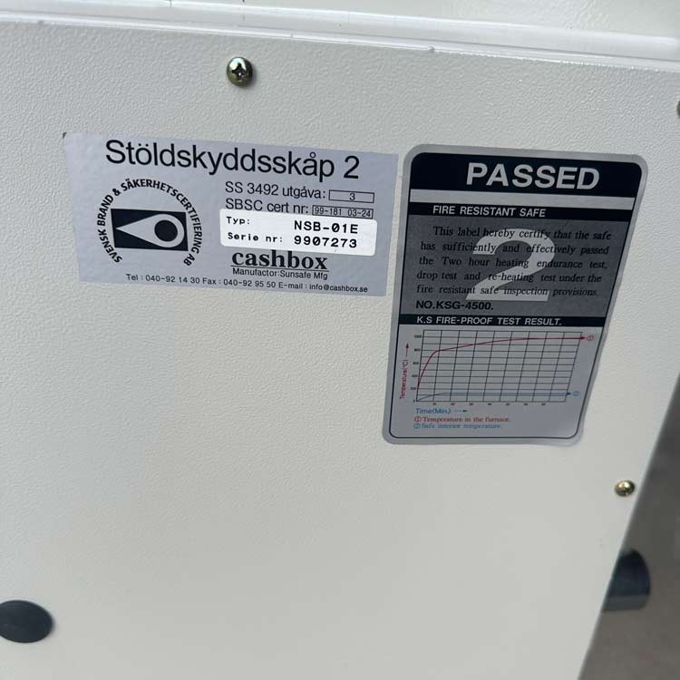 Begagnat säkerhetsskåp från Cashbox. Certifierat enligt SS3492 och har ett brandskydd på 120 minuter(se bild på certifieringsdekal). Skåpet är inrett med en helhylla och kan förankras i botten.