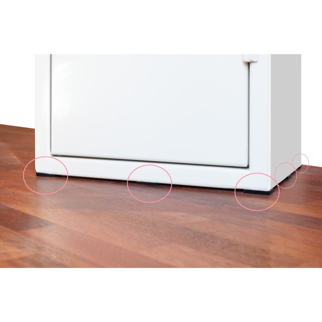 Förslutningssats som möjliggör förslutning av upp till fyra hål i botten/golvet på vapenskåpet, samt det mindre avrinningshålet som finns på vissa modeller i ena hörnet på skåpet. Passar till alla skåp oavsett märke vars botten är 4-6 mm tjock. För att vagnsbultarna inte ska repa golvet ingår nio extra djupa möbeltassar. Ena sidan av möbeltassarna har dubbelhäftande tejp för enkel montering i skåpets botten.