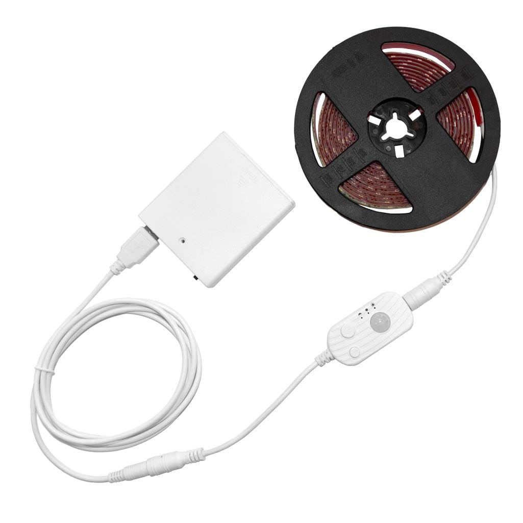 Den rörelseaktiverade sensorn fästs enkelt mot skåpets ena vägg med den medföljande magneten som klistras med dubbelhäftande tejp på sensorna baksida. För bästa resultat, placera sensorn i riktning mot den plats där rörelser förväntas ske. Kom ihåg att undvika att täcka sensorn med föremål. Sensorn drivs via en USB-anslutning och kan kopplas in i den medföljande batteriboxen för batteridrift, eller direkt till ett USB-uttag för eldrift. Kabeln mellan sensorn och batteriboxen har en DC-kontakt som kan kopplas isär. Detta gör att du kan dra ut LED-slingans kabel genom ett av skåpets förankringshål, till exempel för att ansluta den till ett USB-uttag utanför skåpet.